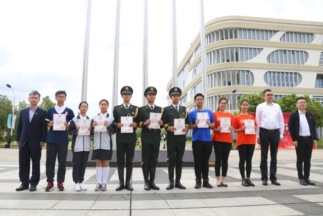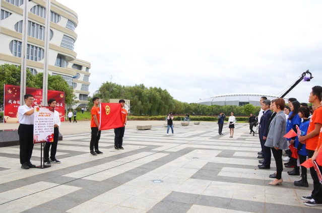 在莊嚴的升旗儀式之后,戴冰向我校“青馬工程”代表授予開班旗幟。隨后,戴冰同陳曉軍、祁明一同為參加今天升旗儀式的團員青年代表頒發活動紀念證書。