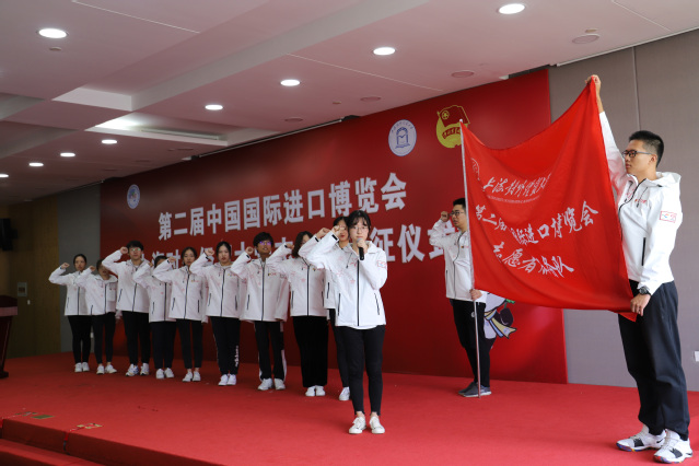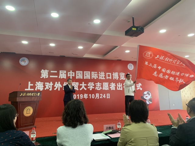 出征儀式上,祁明為第二屆中國國際進(jìn)口博覽會志愿者臨時(shí)黨支部授牌,為第二屆中國國際進(jìn)口博覽會上海對外經(jīng)貿(mào)大學(xué)志愿者服務(wù)隊(duì)授旗。