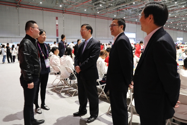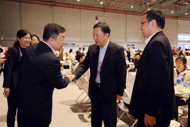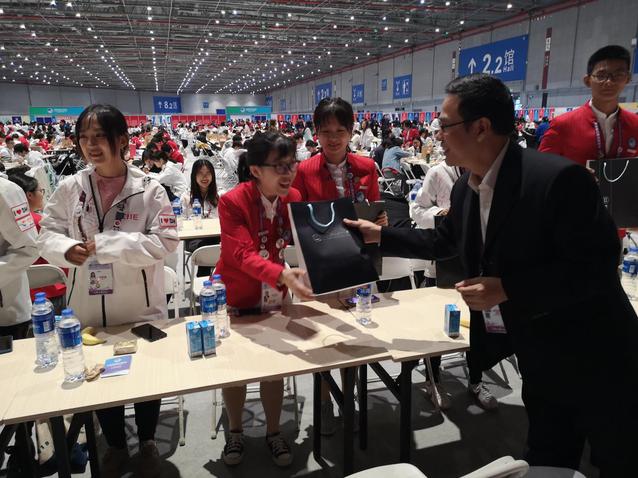 汪榮明、徐永林一行來(lái)到志愿者辦公室慰問(wèn)了綜合接待組的“小葉子”們,并在志愿者休息室與志愿者們共進(jìn)午餐。汪榮明詳細(xì)了解志愿者們的工作內(nèi)容、作息情況和服務(wù)體會(huì)。他肯定了志愿者們?cè)谶M(jìn)博會(huì)場(chǎng)館踐行“奉獻(xiàn)、友愛(ài)、互助、進(jìn)步”的志愿者精神,為進(jìn)博會(huì)的順利舉行貢獻(xiàn)了上經(jīng)貿(mào)大青年的智慧和力量,希望同學(xué)們將此次志愿經(jīng)歷作為大學(xué)中珍貴的回憶,珍惜難得的機(jī)會(huì),展現(xiàn)青春的風(fēng)采。汪榮明、徐永林還向志愿者們送上了志愿者專屬大禮包,叮囑同學(xué)們工作休息兩不誤,在接下來(lái)的幾天中再接再厲,圓滿完成志愿服務(wù)工作。