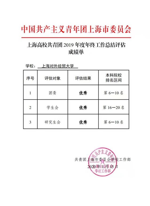 近日,共青團(tuán)上海市委員會(huì)公布了2019年度上海高校共青團(tuán)工作年終考核結(jié)果,我校團(tuán)委、學(xué)生會(huì)、研究生會(huì)考核結(jié)果均為優(yōu)秀。