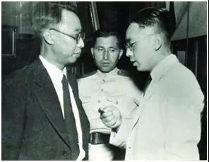 1946年,裘劭恒(右一)與愛新覺羅·溥儀在遠(yuǎn)東國(guó)際軍事法庭出庭時(shí)交流