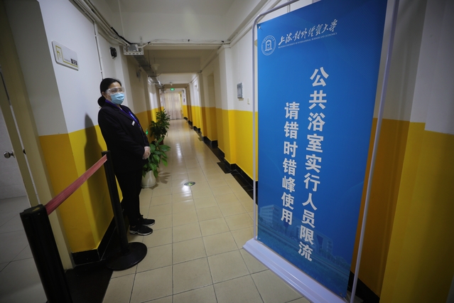 大樓內公共浴室也實行限流、錯峰、錯時、分批使用的方式,保證學生在大樓內生活的安全。公共浴室將延長開放時間,定時清洗消毒,工作人員及時查看浴室內部人員密度,如發現內部人員達到使用閾值,將及時進行限流。