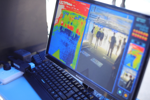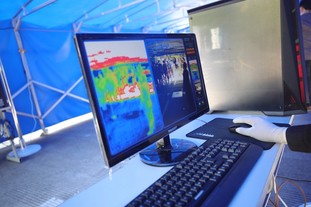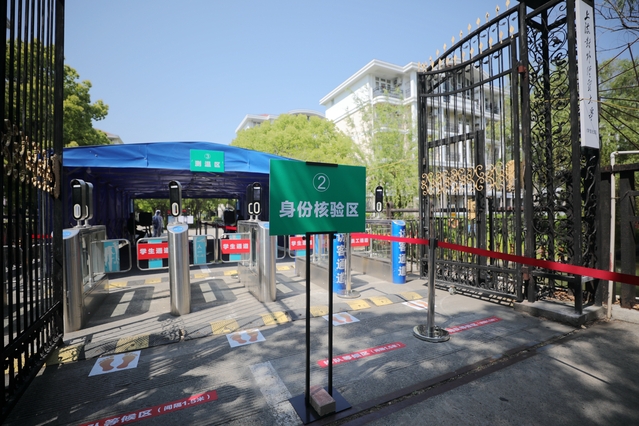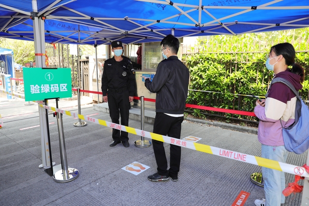 學校在學生社區東門口右側設置隔離通道,地上粘貼間距標識,學生須佩戴口罩間隔1.5米有序排隊,依次進行健康綠碼檢查,通過人臉識別或者刷校園卡進行身份驗證,進入測溫區檢測體溫、接受行李消毒。這是模擬返校學生的演練人員進入學生社區需要過的第一道“關卡”。