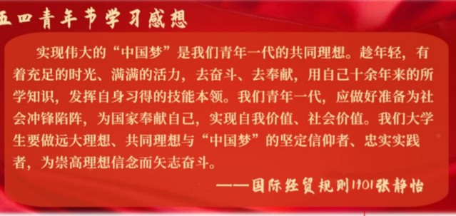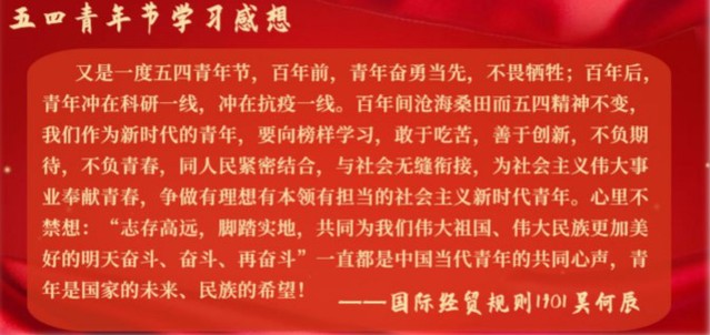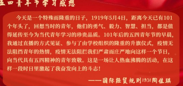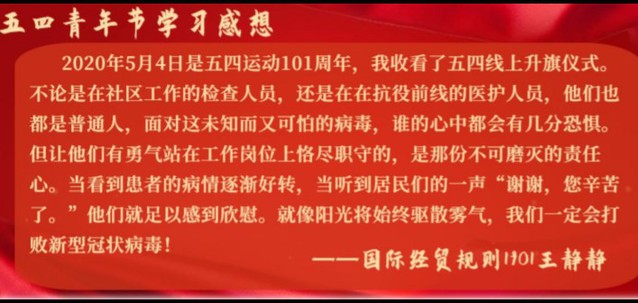 通過觀看五四線上直播,貿易談判學院掀起了通過網絡發聲、書寫感悟的熱潮,引領廣大青年團員們形成了在真學真信中堅定理想信念、在學思悟踐中牢記初心的思想風潮。他們書寫下一份又一份的讀后感、觀后感,充分體會制度自信、學習五四精神,積極用文字表達他們的所思所想。