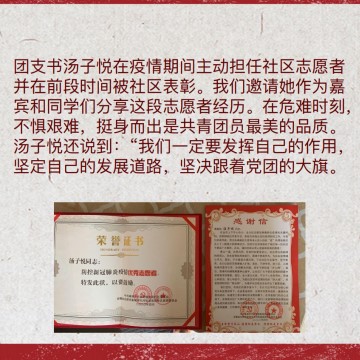 在這場戰“疫”中,很多平凡的青年竭盡所能地投入到抗疫志愿者工作中,他們踐行著雷鋒精神的真諦,傳遞溫暖與信心。回到家鄉的suibers也自覺自愿地為防疫默默付出,工商管理學院對支部中努力傳播正能量、積極參與志愿服務的青年志愿者們進行了線上宣傳,與大家分享他們的經歷,激勵廣大青年提高社會責任感。