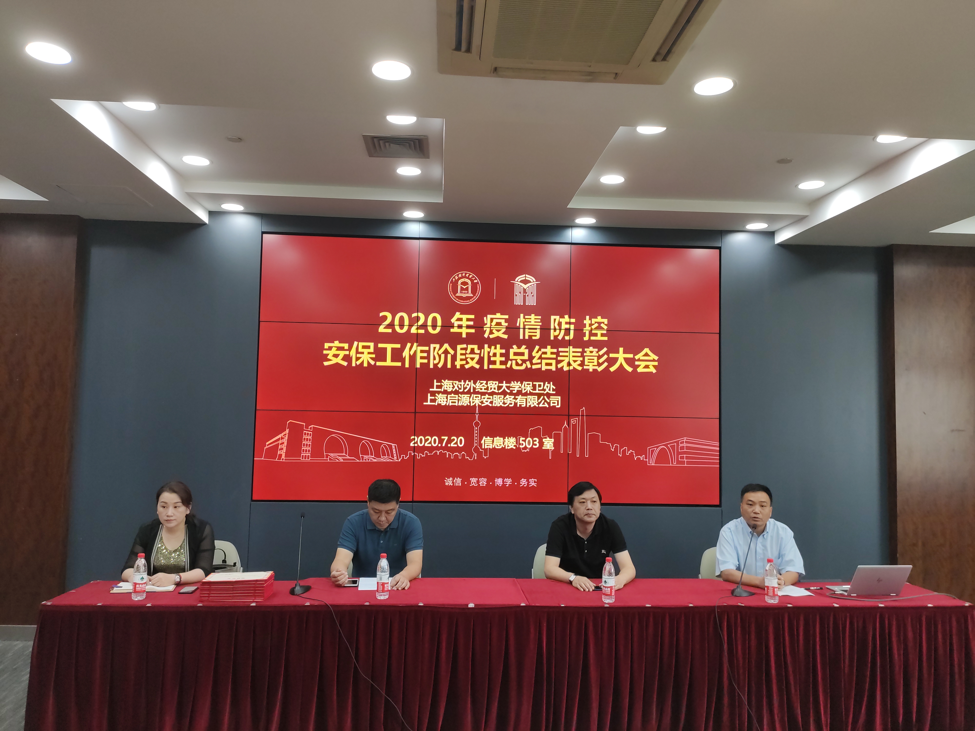 2020年7月20日,上海對外經(jīng)貿(mào)大學疫情防控安保工作階段性總結表彰大會在信息樓503召開,上海對外經(jīng)貿(mào)大學保衛(wèi)處處長夏俊、治安防范科科長馬民杰、上海啟源保安服務有限公司總經(jīng)理周德斌出席會議,啟源公司副總經(jīng)理姚婷、保衛(wèi)處相關科室代表人員及來自古北、松江、七寶三校區(qū)及學生社區(qū)的全體保安隊員(在崗隊員除外)參加會議,會議由馬民杰主持。