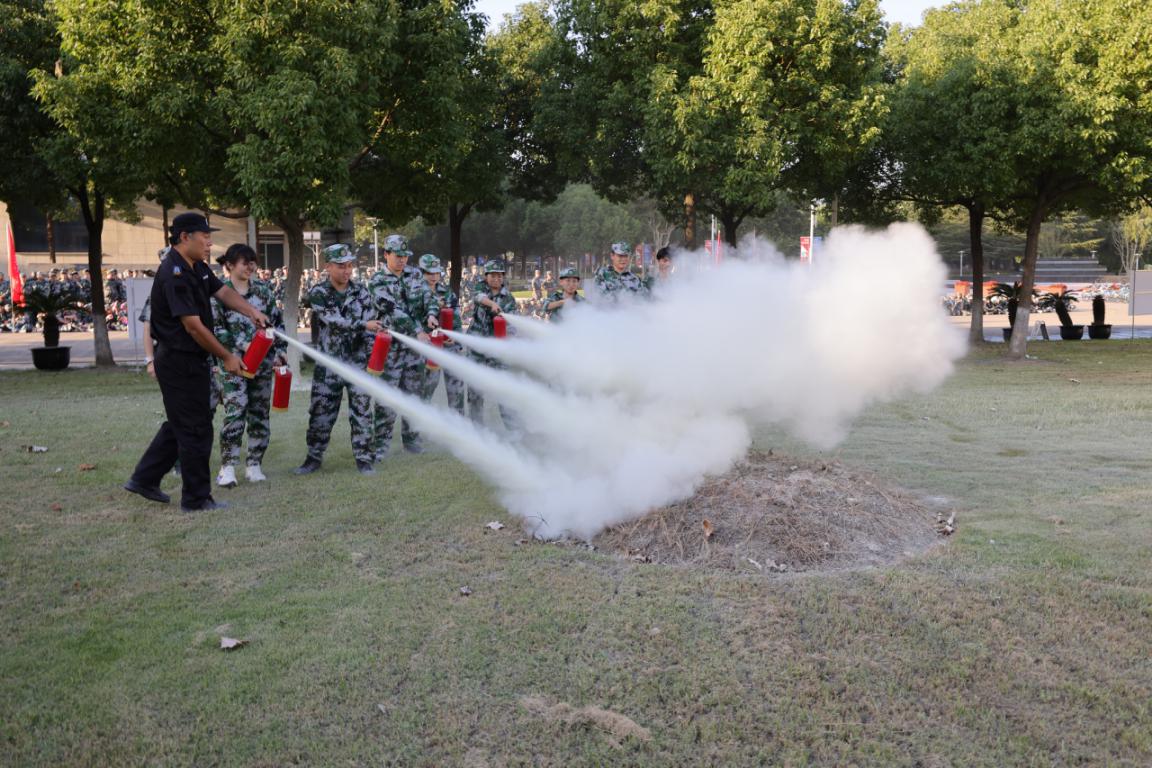 緊急疏散演練結束后,全體新生參加了消防技能實操演練。消防技能實操演練包含兩個部分,一是消火栓的使用觀摩,二是滅火器的使用講解與體驗。現場參訓學生踴躍參與,積極實踐,準確掌握滅火技能。