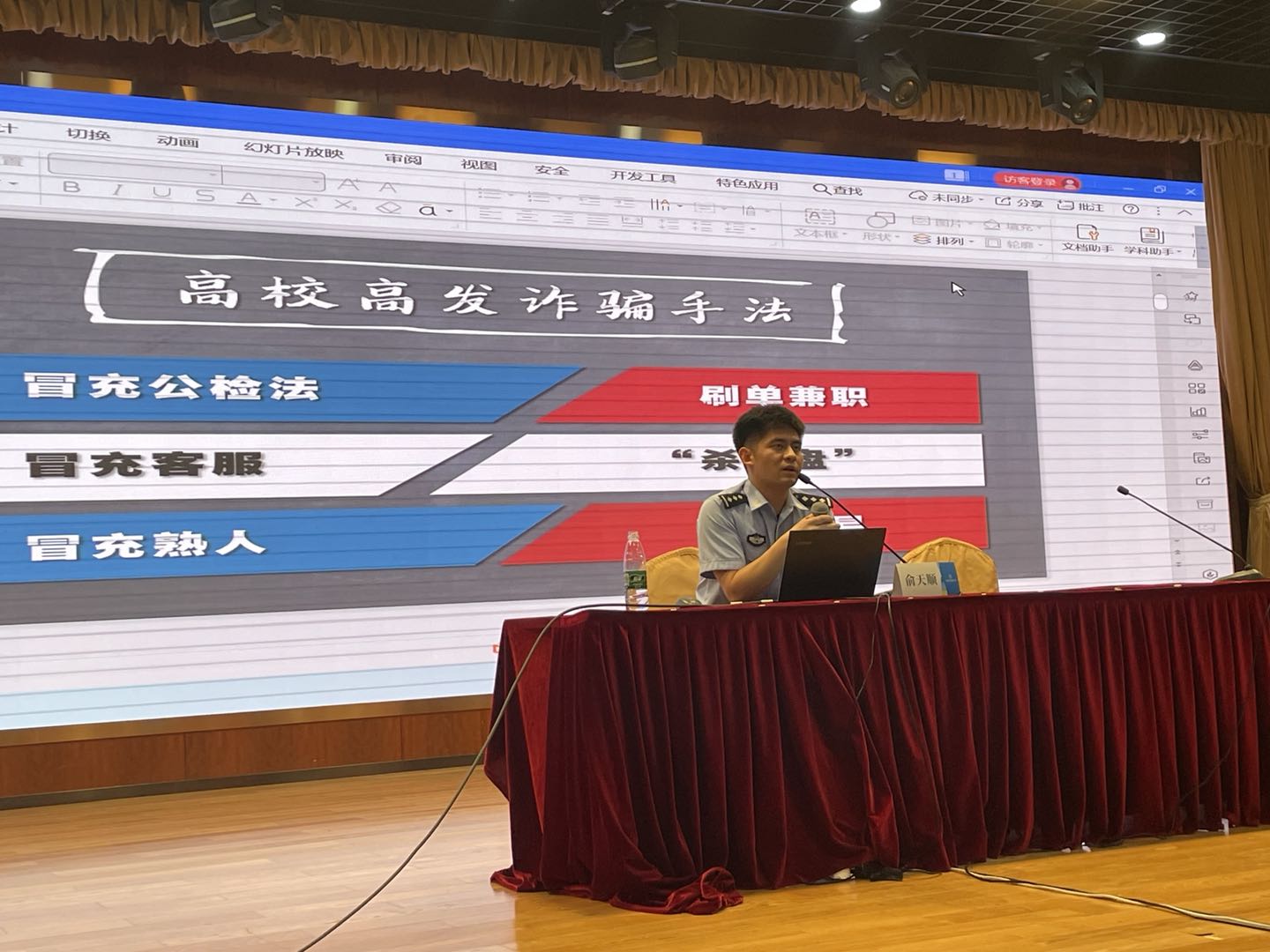 9月19日下午,上海市公安局文保分局俞天順警官為我校全體本科新生作安全教育講座。俞警官從電信詐騙、個人財產安全兩個角度切入,分析了當前高校中發生的電信詐騙案件主要類型,重點向新生群體普及了如冒充公檢法、刷單兼職、冒充客服、“殺豬盤”、網購交易等高發的幾種詐騙手段。俞警官用幽默風趣的語言向學生們還原了多起真實詐騙案件的過程和危害,通過現場同新生互動和討論分析等方法,更是讓同學們認識到電信詐騙案件的危害性,給大家上了一堂精彩的大學生反詐必修課。