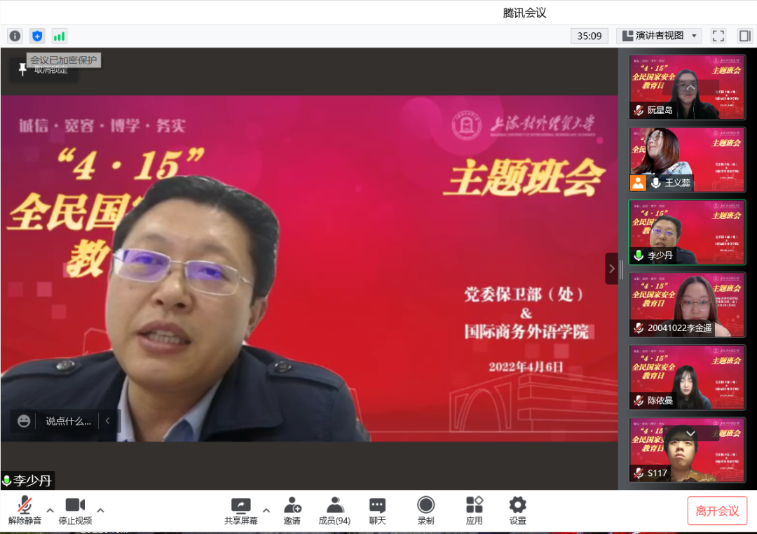 為了以實際行動迎接黨的二十大勝利召開,提高大學生的國家安全意識,在第七個全民國家安全教育日到來之際,黨委保衛部(處)協同國際商務外語學院中英2001班、2002班,商英2001班、2002班,齊聚線上,召開“樹牢總體國家安全觀,感悟新時代國家安全成就”線上主題班會活動。國際商務外語學院輔導員王義蕊主持本次班會,黨委保衛部(處)部長李少丹、保衛處阮星島參加班會。