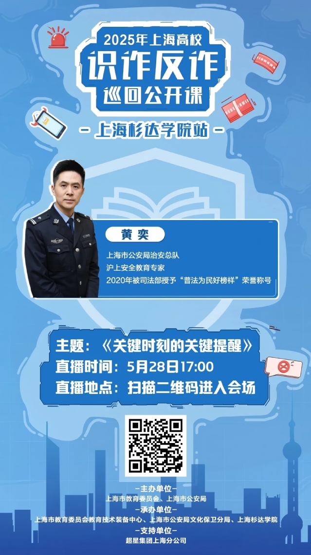 2025年5月28日17點上海高校“識詐反詐”巡回公開課(上海杉達學院站)熱烈開講,“滬上安全教育專家”黃奕警官將以“關鍵時刻的關鍵提醒”為主題,為師生帶來一場別開生面的反詐宣講課,屆時將同步線上直播。歡迎掃描下方二維碼分享和觀看!