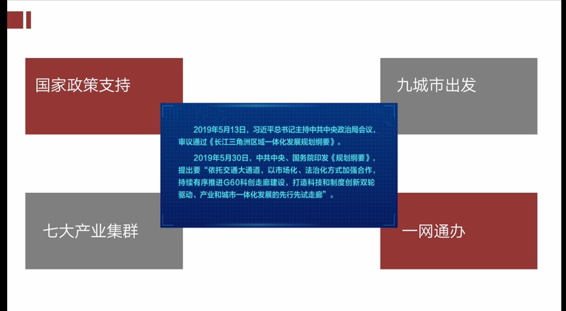 接著,認識完了G60的具體定義后,我們同樣需要認識到自身現(xiàn)狀,這一主題下同樣分為了四個板塊:國家政策支持、九城市出發(fā)、七大產(chǎn)業(yè)集群和一網(wǎng)通辦,同時吳老師也向我們舉出了國家對于G60科創(chuàng)走廊的政策制定。