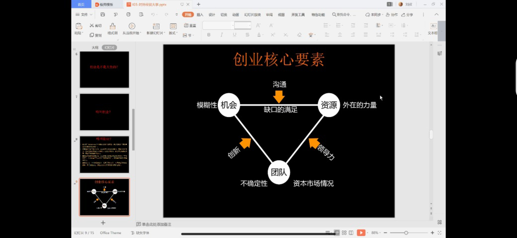 劉叔認為現在的創業一定要是主觀性創業,這樣更容易成功,而被動性創業往往會比較難,因為時代的不同,以前的創業往往因為時代的背景以及社會大環境的影響下被動創業,而當前年代還是要選擇主動性創業,而且在目前的創業不要成為leader,更重要的是成為合伙人,作為一個參與者也更加符合當下的創業環境,同時作為創業者的我們一定要理性創業,不要給學校和家里帶來負擔,同時千萬不要模仿創業遵從自己的想法,創業的核心要素,在創業過程中團隊是最重要的,其次考慮機會。