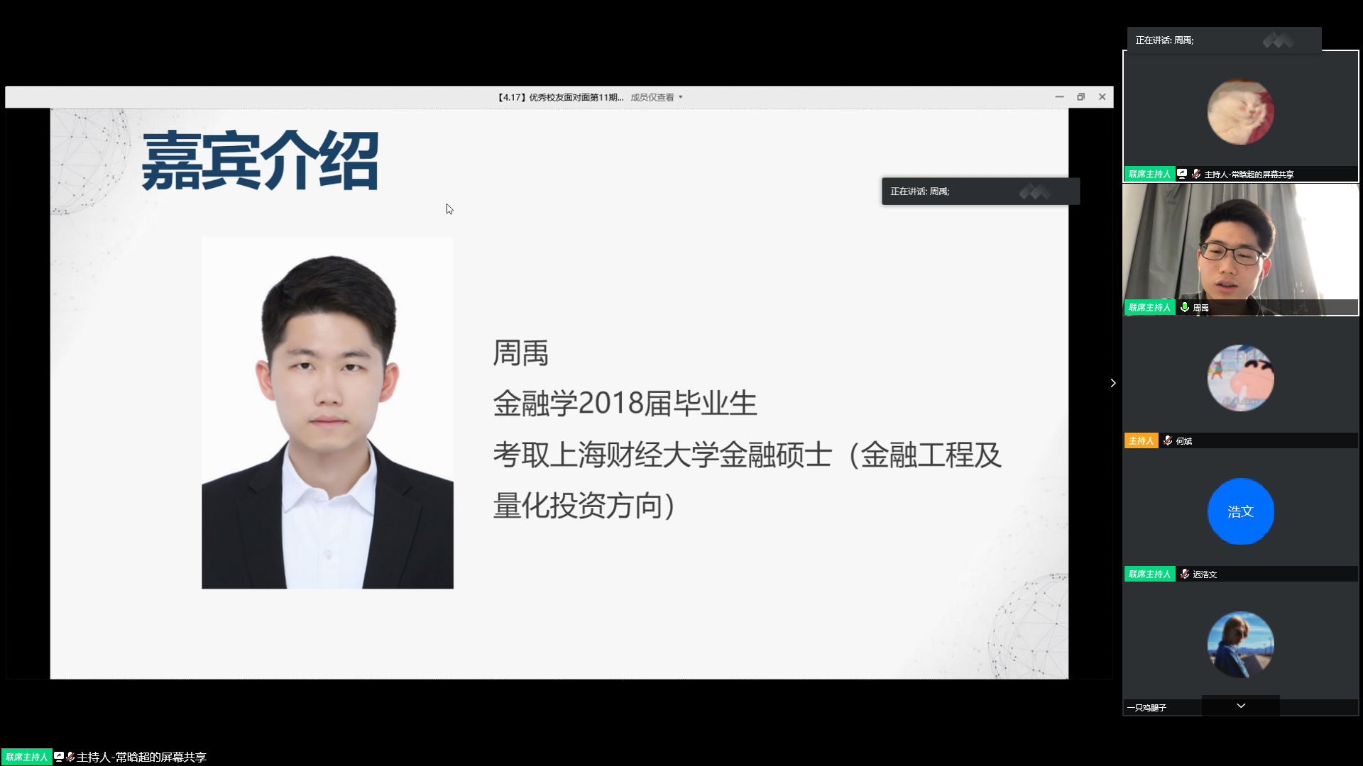 2020年4月17日14:00,上海對(duì)外經(jīng)貿(mào)大學(xué)金融管理學(xué)院“認(rèn)識(shí)一位校友,感悟一段成長(zhǎng)”優(yōu)秀校友面對(duì)面考研復(fù)試云分享依托騰訊會(huì)議平臺(tái),順利舉辦。2018屆校友、現(xiàn)就讀于上海財(cái)經(jīng)大學(xué)金融碩士(金融工程與量化投資方向)的周禹與2019屆校友、現(xiàn)就讀于華東師范大學(xué)會(huì)計(jì)專碩MPAcc的遲浩文受邀出席本次分享會(huì)。