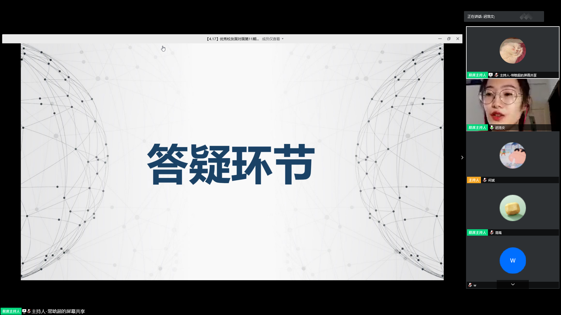 本次分享會(huì)主要面向即將參與到2020年考研復(fù)試的16級(jí)的同學(xué)們,使同學(xué)們?cè)谂c優(yōu)秀校友的親切交談中獲得寶貴經(jīng)驗(yàn),從而更好地投入到即將到來的考研復(fù)試中。“認(rèn)識(shí)一位校友,感悟一段成長(zhǎng)”優(yōu)秀校友面對(duì)面活動(dòng)是金融管理學(xué)院推進(jìn)“三全育人”的重要環(huán)節(jié),優(yōu)秀校友精神的不斷傳承激勵(lì)同學(xué)們堅(jiān)持自我完善,努力成長(zhǎng)為國家需要的全方面發(fā)展的高素質(zhì)人才。