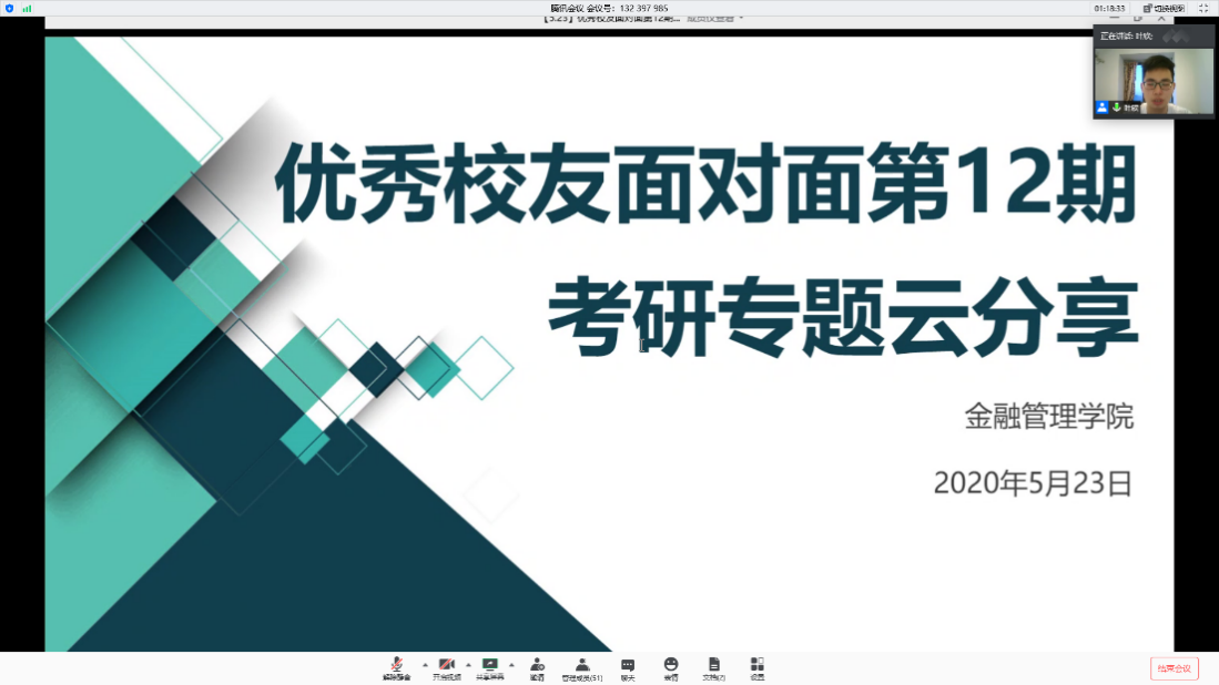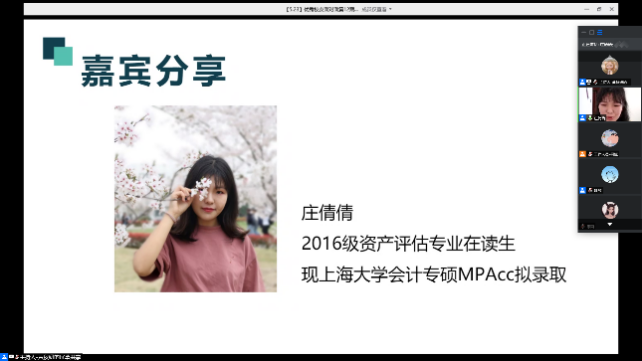 2020年5月23日(周六)18:00,上海對外經貿大學金融管理學院“認識一位校友,感悟一段成長”優秀校友面對面(第12期)之考研經驗云分享活動依托騰訊會議平臺順利舉辦。學院2019屆校友、現就讀于上海財經大學資產評估碩士的葉欣與學院2020屆應屆畢業生、現擬錄取上海大學會計碩士的莊倩倩受邀出席本次分享會。