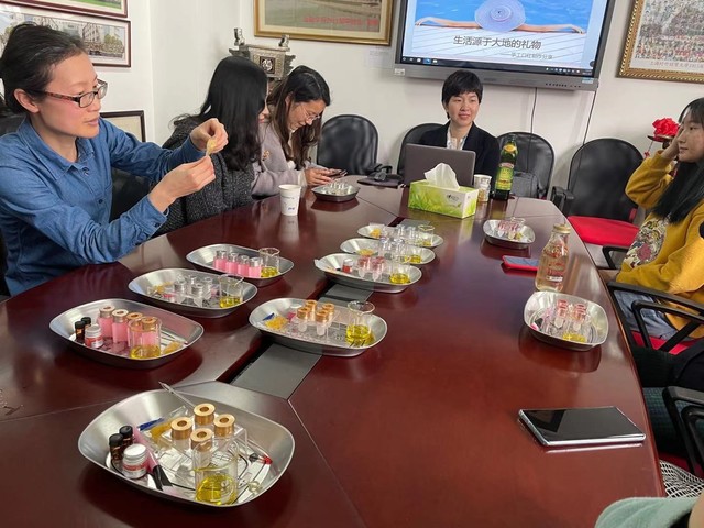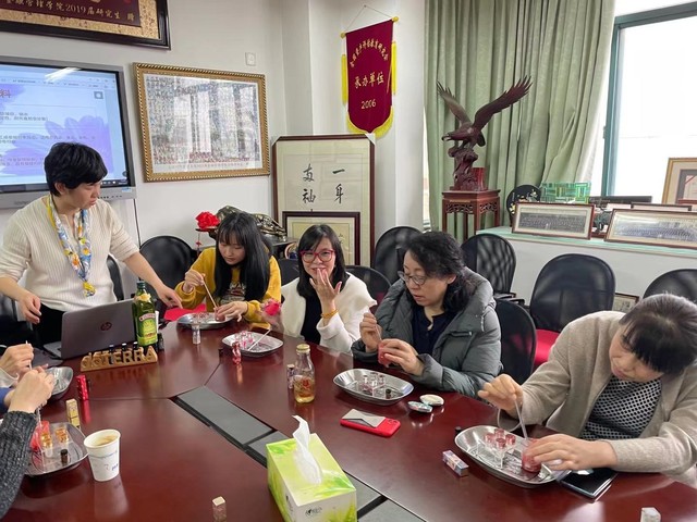 本次活動中,植物精油療法師以純天然精油為主題,配以有機橄欖油、天然蜂蠟、維生素E、植物色粉、理療級精油等原材料制作DIY口紅?;顒娱_始,每位老師挑選自己心儀的口紅外殼,口紅模具以及色粉,把會接觸到口紅的制作工具進行消毒。然后調制色粉,研磨、加熱、攪拌、倒模、冷藏、包裝。療法師邊講解邊演示制作步驟 。老師們跟著老師的演示步驟認真的聆聽、制作,互相切磋、互相交流,全場洋溢著歡聲笑語,大家沉靜在歡樂的氛圍中。