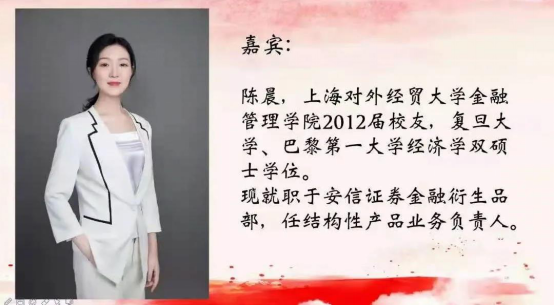 5月29日下午,金融管理學院“想把我講給你聽”校友黨課在線上順利舉辦。本次黨課由學院2012屆優秀黨員校友,現安信證券金融衍生品部結構性產品業務負責人陳晨主講,學院黨員教師徐同飛、劉一平及近一百位入黨積極分子參與。