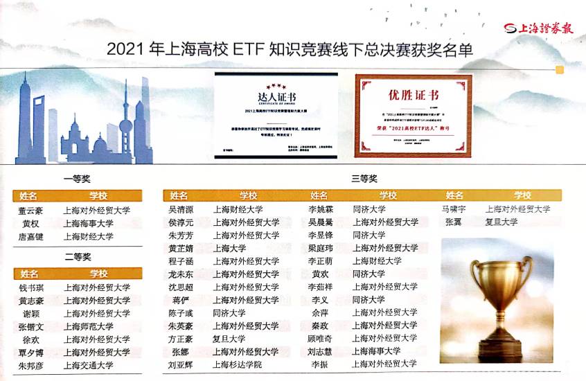 參加此次活動是我校數(shù)字金融產業(yè)學院在實現(xiàn)產教深度融合,培養(yǎng)適應和引領現(xiàn)代產業(yè)發(fā)展的高素質應用型、復合型、創(chuàng)新性人才的重要舉措。為進一步深化落實滬教委高【2021】64號文,以及《上海市深化產教融合協(xié)同育人行動計劃(2021-2025)》,數(shù)字金融產業(yè)學院已經跟上海證券報達成進一步合作計劃,開設校企合作課程《上證報—上證投資家高校專題課“ETF投資與行業(yè)估值比較分析”》,即將于2021-2022學年第二學期面向全校學生開課。期待明年的大賽中再結碩果,再創(chuàng)輝煌!
