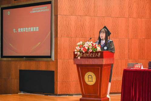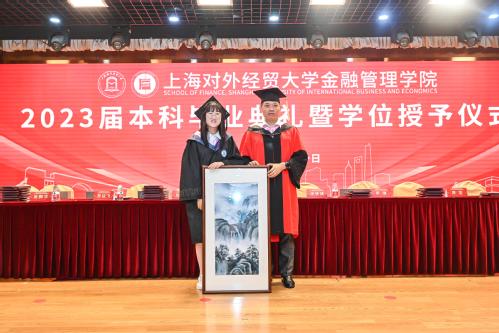 畢業生代表徐潔霏同學分享了自己大學四年的點點滴滴。時光如水,記憶如磐,對她而言,校園內的一草一木、每一座建筑都有著不同且深刻的意義,大學的四年時光更讓她從靦腆變得自信、專業。“誠信、寬容、博學、務實”的八字校訓也已經成為她精神中的一部分。她代表全體畢業生對老師們的付出表達了感謝,并希望同學們無論身在何處,都能走好腳下的路,繼續譜寫屬于自己的輝煌人生。最后,她用自己的方式,代表全體2023屆畢業生為學院獻上了一份珍貴的禮物——一幅親手繪制的中國山水畫,以表達對學院的感激之情。