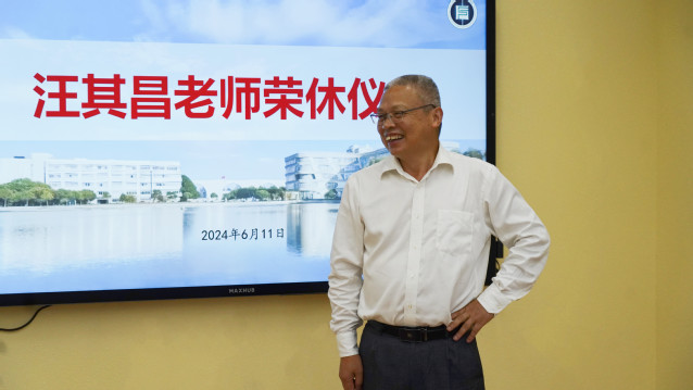 汪其昌老師發表榮休感言,他回顧了自己從教以來的工作歷程,分享了心得體會,對同事們一直以來的照顧和包容表示衷心感謝。他表示將繼續關心和支持學院發展,希望未來能與同事們保持聯系,多多交流。
