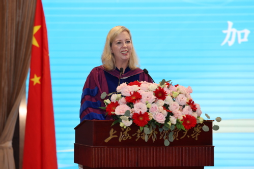 Kathy Denton為畢業生們獻上祝福。她對全體畢業生表示祝賀,對同學們取得的成就表示贊許。她表示,中加合作項目的課程結構和全英語學習對同學們來說極具挑戰,但所有人都為自己設定了非常高的標準并出色地完成了目標。她強調了合作項目在同學們求學路上的重要意義,希望同學們能夠在將來選擇職業時,牢記在學校所學所獲,對新的機會保持開放的態度,充分挖掘自己的潛力實現偉大成就。