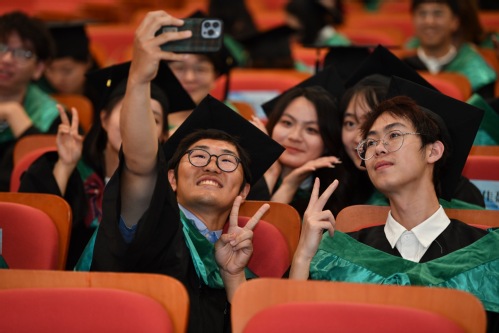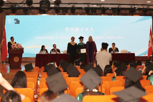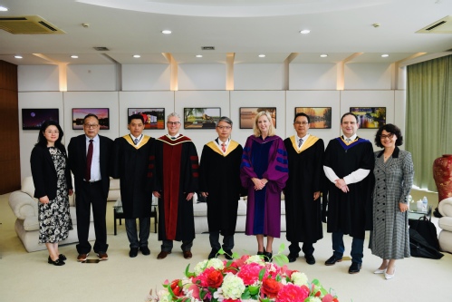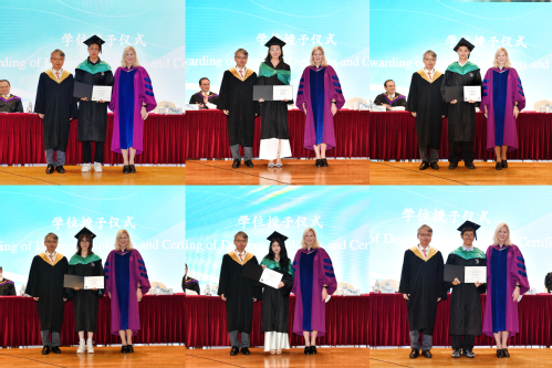 在學位授予儀式上,徐永林宣讀畢業生名單,Kathy Denton與祁明為各位畢業生頒發文憑、撥穗并合影留念。