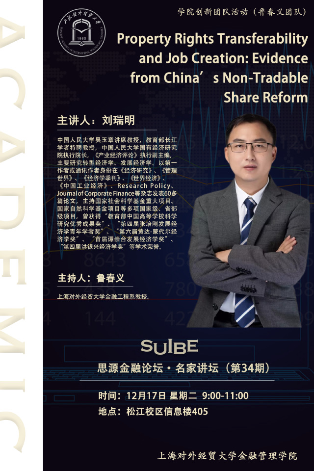 【SUIBE思源金融論壇——名家講壇第34期】Property Rights Transferability and Job Creation: Evidence from China’s Non-Tradable Share Reform
