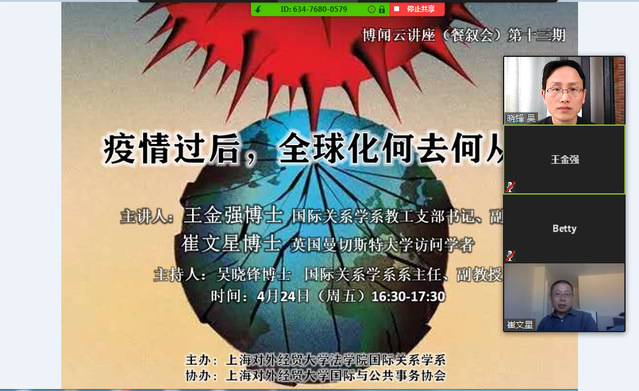 2020年4月24日,國際關系學系第十三期“博聞餐敘會”以云講座的形式如期而至。國際關系學系教工支部書記、副教授王金強博士和目前正在英國曼徹斯特大學訪學的崔文星博士作為聯合主講人,就“疫情過后,全球化何去何從”的主題分享各自的觀點和看法,國際關系學系主任吳曉鋒副教授主持講座。法學院國政專業學生、畢業校友及相關專業師生六十余人參加了本次云講座。