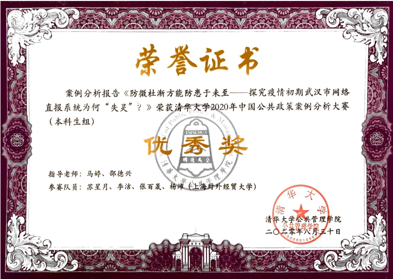 清華大學2020年中國公共政策案例分析大賽決賽于2020年8月30日云上舉行。法學院指導老師邵德興、馬婷和2018級本科生蘇星月、李潔、楊沛、張百晟組成的“貿大筑夢隊”在本次大賽中榮獲優秀獎。自2016年以來,清華大學公共管理學院已連續四年舉辦此類大賽。大賽累計共吸引來自海內外261所高校的1796支隊伍、7102人報名參賽,在公共管理學界具有頗高的知名度和影響力。