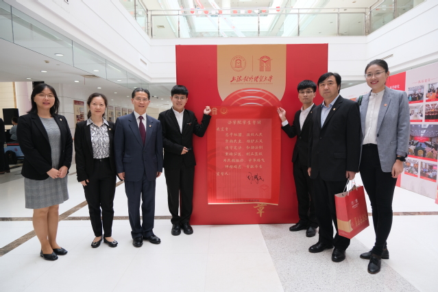 上海市政協(xié)副主席、法學(xué)院名譽院長、杰出校友周漢民在建校60周年紀(jì)念大會暨“上海開放經(jīng)濟論壇”開幕式大會上致辭。周漢民深情回憶了與母校共同走過的40多年心路歷程,他將母校波瀾壯闊的60年發(fā)展歷史比作一首“澎湃、壯麗而引領(lǐng)未來的歌”。他指出,母校博大的胸懷和格局,造就了8萬多名國際經(jīng)貿(mào)人才。母校就如同日月星辰照亮廣大上經(jīng)貿(mào)大學(xué)子的人生,所有上經(jīng)貿(mào)大學(xué)子一輩子都應(yīng)該努力奮斗,為母校爭光。周漢民回顧了在浦東開發(fā)開放早期研究、中國復(fù)關(guān)入世決策咨詢、申請和籌辦世博會、推進自貿(mào)區(qū)建設(shè)等重要工作中所作出的貢獻,表示自己所取得的每一個成就都離不開母校深遠的影響。“誠信、寬容、博學(xué)、務(wù)實”的校訓(xùn)是母校給上經(jīng)貿(mào)大人最好的哺育和教誨,需要每一位上經(jīng)貿(mào)大人用一生去踐行的要求。最后,周漢民號召全體上經(jīng)貿(mào)大校友共同為祖國現(xiàn)代化強國建設(shè)和中華民族偉大復(fù)興努力奮斗。大會結(jié)束后,周漢民在其倡議起草的法學(xué)院學(xué)生誓詞宣誓人處簽名并合影留念。