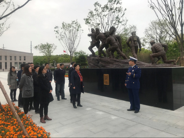在剛建成的上海消防英烈紀念園內,全體黨員瞻仰了《蹈火者》雕塑和消防英烈紀念碑,深切緬懷新中國成立以來為上海建設事業英勇獻身的42名消防烈士。隨后,消防員戰士帶領大家參觀了“永恒的閃耀”上海消防英烈紀念展。