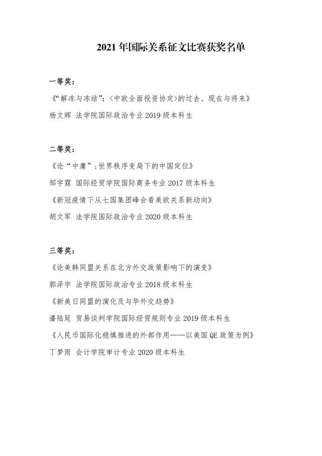 本次征文活動共收到本科生論文二十多篇,學生來自全校不同院系、不同專業。獲獎論文中,既有像郭澤宇《論美韓同盟在北方外交政策影響下的演變》等聚焦于傳統國家間關系與外交政策的作品,也有與國際經濟金融領域跨專業融合的作品,還有如鄒宇霆同學《論“中庸”:世界秩序變局下的中國定位》等立足于中華優秀傳統文化深厚養分、與當代中國現實相結合的佳作,充分展現了我校學子廣博的知識面、精深的專業知識,以及連接當代中國過去與未來的使命意識。
