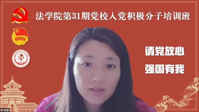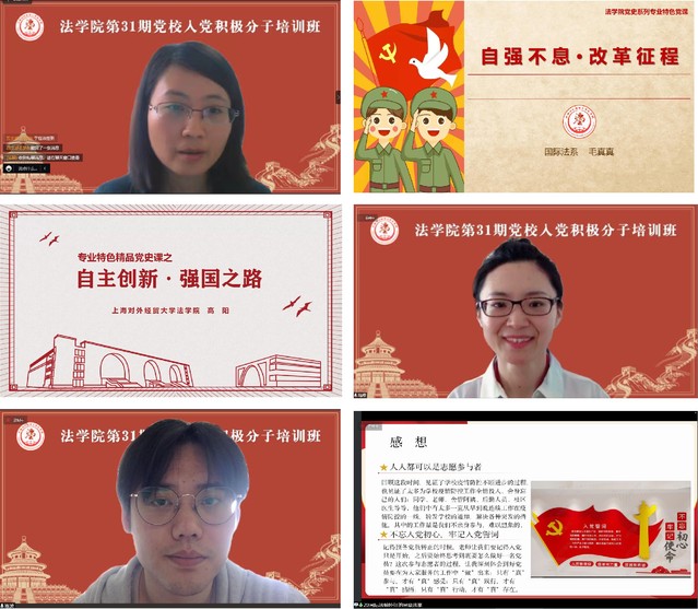 法學院黨委堅持對團員青年的入黨教育不斷線,在黨校形式和內容上都做了精心設計和創新,有效提升了教育培養的實效。從4月26日開班以來,組織了豐富的理論學習,邀請了校黨委組織員張燕老師講授專題黨課“奮斗鑄就青春本色,‘疫’線淬煉入黨初心”,馬克思主義學院張帥老師解讀十九屆六中全會精神和《中共中央關于黨的百年奮斗重大成就和歷史經驗的決議》;由學院4位青年黨員教師馬婷、連波、毛真真、高陽聯袂講授法學院黨史系列專業特色黨課,將黨史與專業知識相融合;特設2場“朋輩黨課”,由3名學生黨員分享“讓青春在黨旗下成長”初心成長故事,和4名入黨積極分子講述“青年先鋒‘疫’路先行”的實踐服務經歷。黨校期間,恰逢五四運動103周年,馮予婧在黨課上領學了習近平總書記在中國人民大學考察時的重要講話。此外,黨校還鼓勵團員青年通過學習強國平臺加強理論自學,通過“紅途”VR小程序開展云端紅色之旅了解黨史。