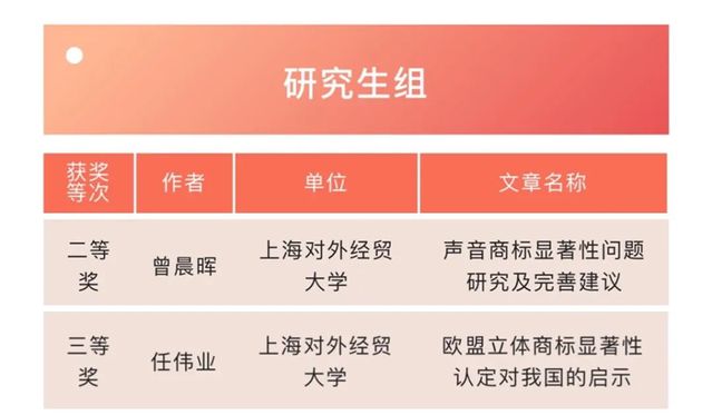 我校榮獲“優秀組織獎”;我校法學院2021級知識產權法專業研究生曾晨暉榮獲“研究生組”二等獎、2021級知識產權法專業研究生任偉業榮獲“研究生組”三等獎,法學院民商經濟法學系知識產權法專業高陽、劉潤濤兩位老師榮獲“優秀指導教師獎”。