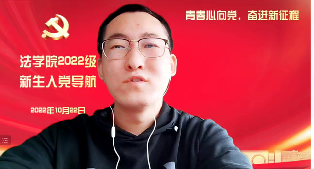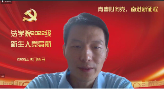 為進一步貫徹落實黨的二十大精神,加強新生的思想引領,用黨的科學理論武裝青年,用黨的初心使命感召青年,10月22日上午,法學院在線舉行“青春心向黨,奮進新征程”2022級新生入黨導航。校關工委法學院分會副主任張菊英、學院黨委副書記商志民、黨委組織員馮予婧、學生黨員代表霍俊先、各學生黨支部書記以及全體新生參加活動。活動由馮予婧主持。