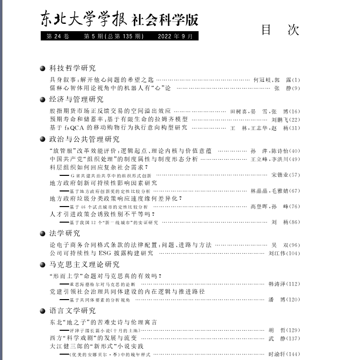 《論電子商務合同格式條款的法律配置:問題、進路與方法》,載于《東北大學學報(社會科學版)》2022年第5期