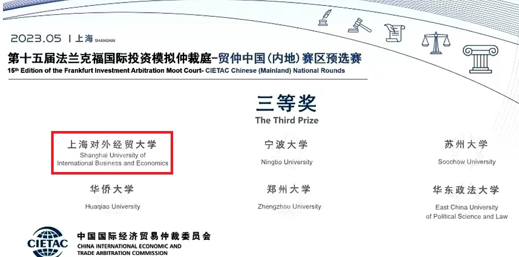 5月8日至12日,第十五屆法蘭克福國際投資模擬仲裁庭中國(內地)賽區預選賽在復旦大學舉行。上海對外經貿大學代表隊在循環賽中分別戰勝廣東外語外貿大學、西南財經大學、北京理工大學,榮獲全國三等獎。依達依提·艾依菲爾、唐曉樂同學摘得“最佳辯手”獎,劉希萌同學榮獲“團隊突出貢獻”獎。本次比賽包括清華大學、復旦大學、上海交通大學、四川大學在內的38所高校報名參賽,規模為歷屆之最。