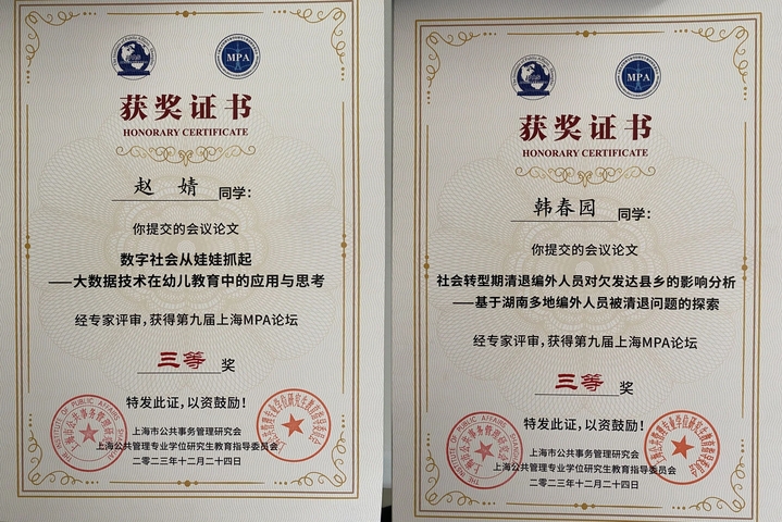 2023級MPA趙婧同學(指導老師:邵德興)撰寫論文《數字社會從娃娃抓起——大數據技術在幼兒教育中的應用與思考》,韓春園同學(指導老師:吳曉鋒)撰寫論文《社會轉型期清退編外人員對欠發達縣鄉的影響分析——基于湖南多地編外人員被清退問題的探索》,在第九屆上海MPA論壇上均榮獲三等獎。