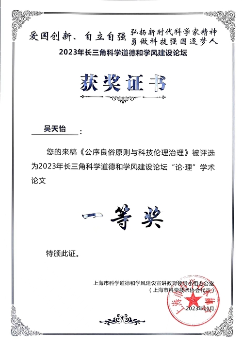2021級國際法學專業研究生吳天怡同學(導師:朱懷念)撰寫論文《公序良俗原則與科技倫理治理》,在2023年長三角科學道德和學風建設論壇上榮獲學術論文一等獎。