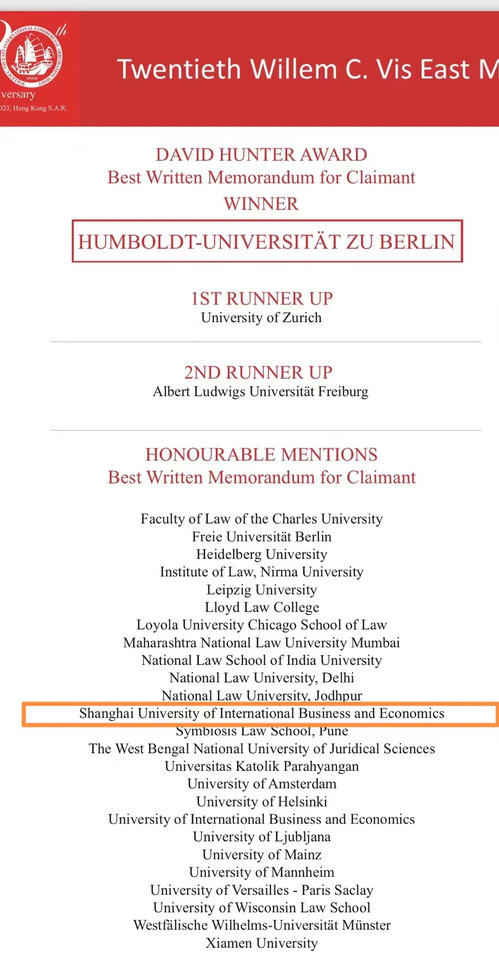 3月26日,第20屆國際商事模擬仲裁庭賽事“Willem C. Vis East Moot”在中國香港落下帷幕。我校代表隊(duì)在眾多名校中突出重圍,榮獲全球最佳申請人書狀榮譽(yù)提名獎(Honorable Mention for Best Memorandum on Behalf of Claimant),成為本屆賽事中僅有三支所獲此殊榮的中國高校之一。
