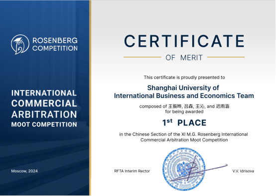 2024年3月26日至29日,米哈伊爾·格里戈里耶維奇·羅森堡國際商事仲裁學生競賽(Rosenberg M.G. International Commercial Arbitration Moot Competition,以下簡稱“羅森堡競賽”)在俄羅斯莫斯科舉辦。我校代表隊在線參賽,經過循環賽激烈對抗,晉級中文組決賽,最終榮獲冠軍,同時還獲得“被申請人最佳書狀”獎。本次比賽也得到了學校外事處的大力支持。