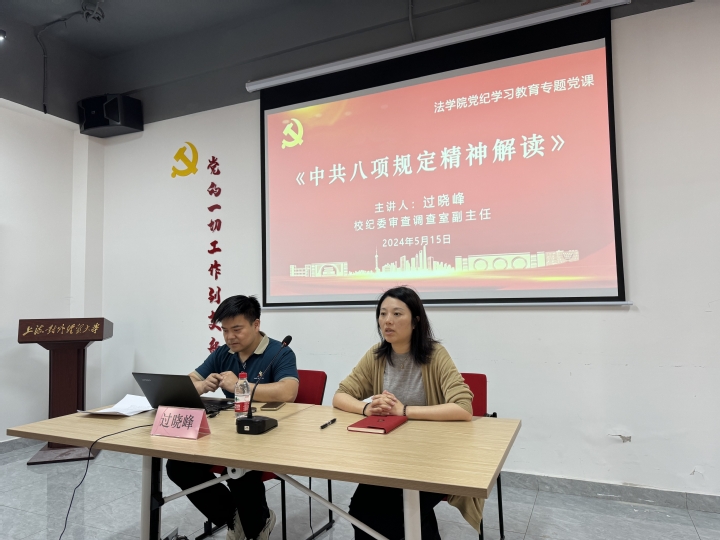 5月15日下午,法學(xué)院黨委在校黨建服務(wù)中心開展黨紀(jì)學(xué)習(xí)教育專題黨課。本次學(xué)習(xí)教育以“廉政講堂”的形式,邀請了校紀(jì)委審查調(diào)查室副主任過曉峰老師為大家?guī)韺n}黨課。法學(xué)院各黨支部書記、紀(jì)檢委員、學(xué)院師生黨員代表近40人參加了本次學(xué)習(xí)。法學(xué)院黨委書記黃靜主持黨課。