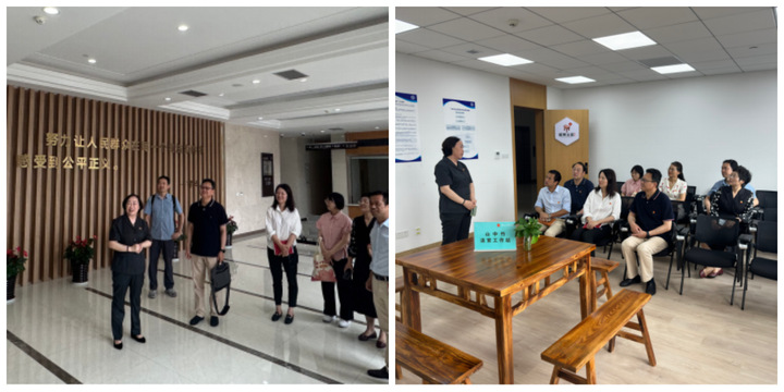 簽約前,楊劍萍親自帶領參會人員參觀和講解被稱為“滬尚新‘楓’景”“楓橋式人民法庭”的佘山法庭的建設情況,帶領大家深刻感受佘山法庭“楓橋經驗”的實踐探索歷程。