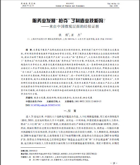 鐵瑛、崔杰,“服務業發展‘搶奪’了制造業技能嗎?—?來自中國微觀層面的經驗證據”,財經研究,2020年第12期