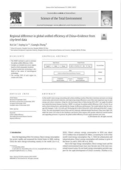 Kui Liu,Suying Lu&Guanglu Zhang,“Regional difference in global unified efficiency of China—Evidence from city-level data”, Science of the Total Environment,2020(713)