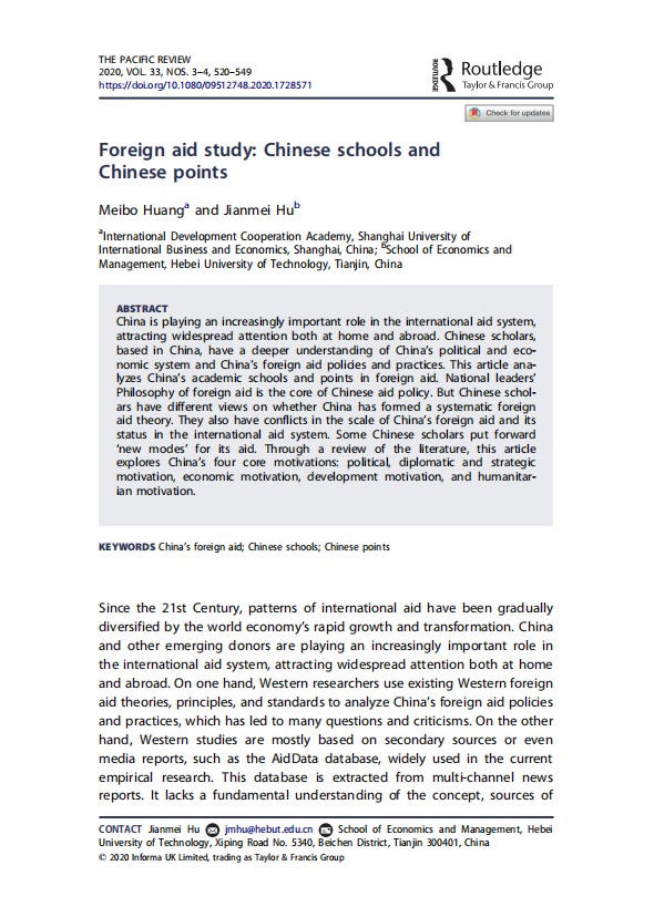 Meibo Huang & Jianmei Hu,“Foreign aid study: Chinese schools and Chinese points”,The Pacific Review,DOI:10.1080/09512748.2020.1728571 ,Feb 2020