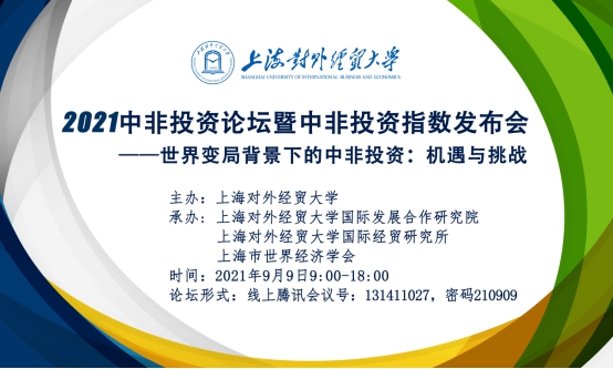 9月9日,由上海對外經(jīng)貿(mào)大學(xué)主辦,上海對外經(jīng)貿(mào)大學(xué)國際發(fā)展合作研究院、國際經(jīng)貿(mào)研究所、上海市世界經(jīng)濟(jì)學(xué)會承辦的“2021中非投資論壇暨中非投資指數(shù)發(fā)布會”研討會通過視頻會議形式舉行。本次研討會以“世界變局下的中非投資:機(jī)遇與挑戰(zhàn)”為主題,來自國際機(jī)構(gòu)、金融機(jī)構(gòu)、企業(yè)及中國最重要的非洲研究機(jī)構(gòu)如中國社科院西亞非洲研究所、南開大學(xué)、南京大學(xué)、廈門大學(xué)、山東大學(xué)、浙江師范大學(xué)、廣東外語外貿(mào)大學(xué)等在非洲經(jīng)濟(jì)研究領(lǐng)域擁有卓越影響力的專家學(xué)者出席了本次論壇并對世界變局下的中非投資合作問題進(jìn)行了深入探討。