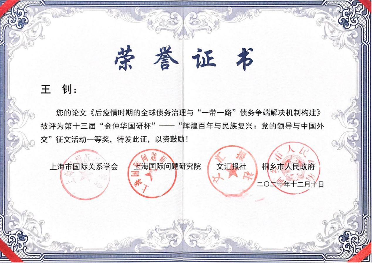 研究所研究院王釗助理研究員的論文《后疫情時期的全球債務治理與“一帶一路”債務解決機制和構建》被評為第十三屆“金仲華國研杯”——“輝煌百年與民族復興:黨的領導與中國外交”征文活動一等獎,2021年12月10日。