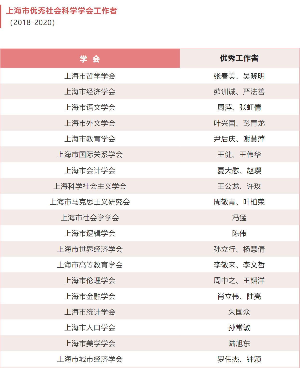 20211117日,上海市社聯為推動本市社會科學學會和民辦社會科學研究機構的培育和建設,提高管理水平,充分發揮其在社會主義經濟建設、政治建設、文化建設、社會建設、生態文明建設中的各項功能,開展了2018-2020年度上海市優秀社會科學學會、上海市優秀民辦社會科學研究機構、上海市優秀社會科學學會工作者、上海市社會科學學會特色活動、上海市社會科學學會品牌活動的評選工作。經申報、初審、互評、終評和社聯黨組審核通過,現將評選結果予以公布。希望各學會和民辦社科研究機構在今后的工作中再接再厲,促進上海社會科學事業繁榮發展,為實現第二個百年奮斗目標、實現中華民族偉大復興的中國夢而不懈奮斗。