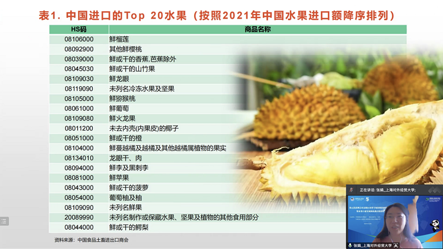 2022年5月25日下午,第五屆進博會食品展區水果專場推介會暨水果行業發展新機遇在線論壇成功舉辦。上海對外經貿大學國際經貿研究所張娟副研究員分享了中國水果進口貿易的現狀、RCEP實施后水果進口的機遇和挑戰,特別分析了RCEP成員國水果相關產業國際投資的新規定、關稅減讓給企業帶來的成本下降等問題。